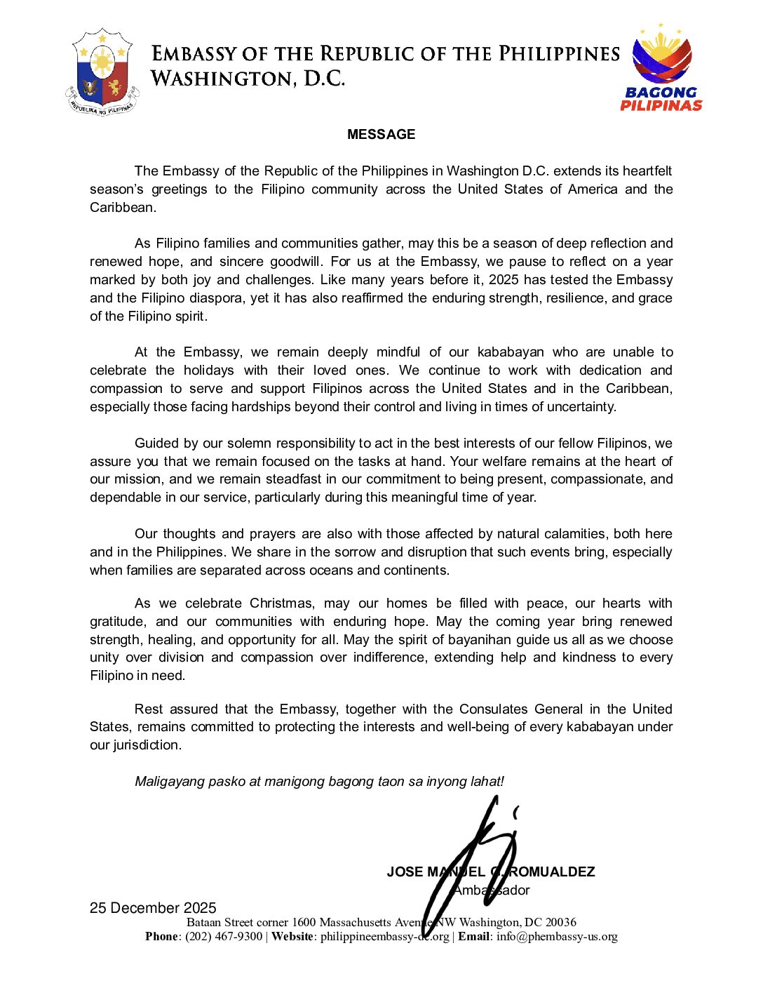 2025 HOLIDAY MESSAGE FROM THE AMBASSADOR