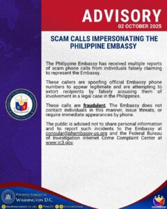 The Philippine Embassy has received multiple reports of scam phone calls from individuals falsely claiming