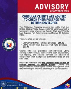 The Philippine Embassy informs the public that the United States Postal Service (USPS) will implement