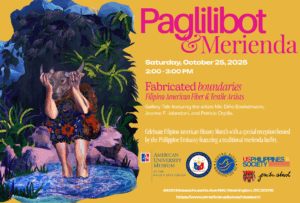 Announcements PAGLILIBOT & MERIENDA – FABRICATED BOUNDARIES: FILIPINA AMERICAN TEXTILE & FIBER ARTISTS Join us as Filipina-American artists Mic Diño Boekelmann, Jeanne Jalandoni, and Patricia Orpilla discuss their Read More » October 16, 2025