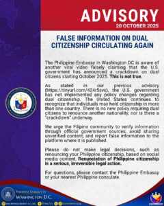 Announcements FALSE INFORMATION ON DUAL CITIZENSHIP CIRCULATING AGAIN The Philippine Embassy in Washington DC is aware of another viral video falsely claiming that Read More ยป October 20, 2025
