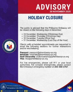 Announcements HOLIDAY CLOSURE – DECEMBER 2025 The public is advised that the Philippine Embassy will be closed on the following days Read More » November 30, 2025