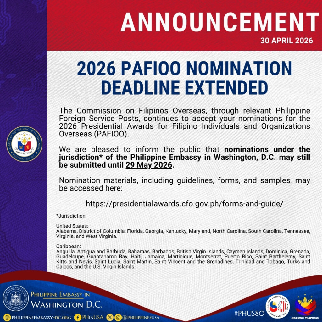 We are pleased to inform the public that nominations under the jurisdiction* of the Philippine Embassy in Washington, D.C. may still be submitted until 29 May 2026.