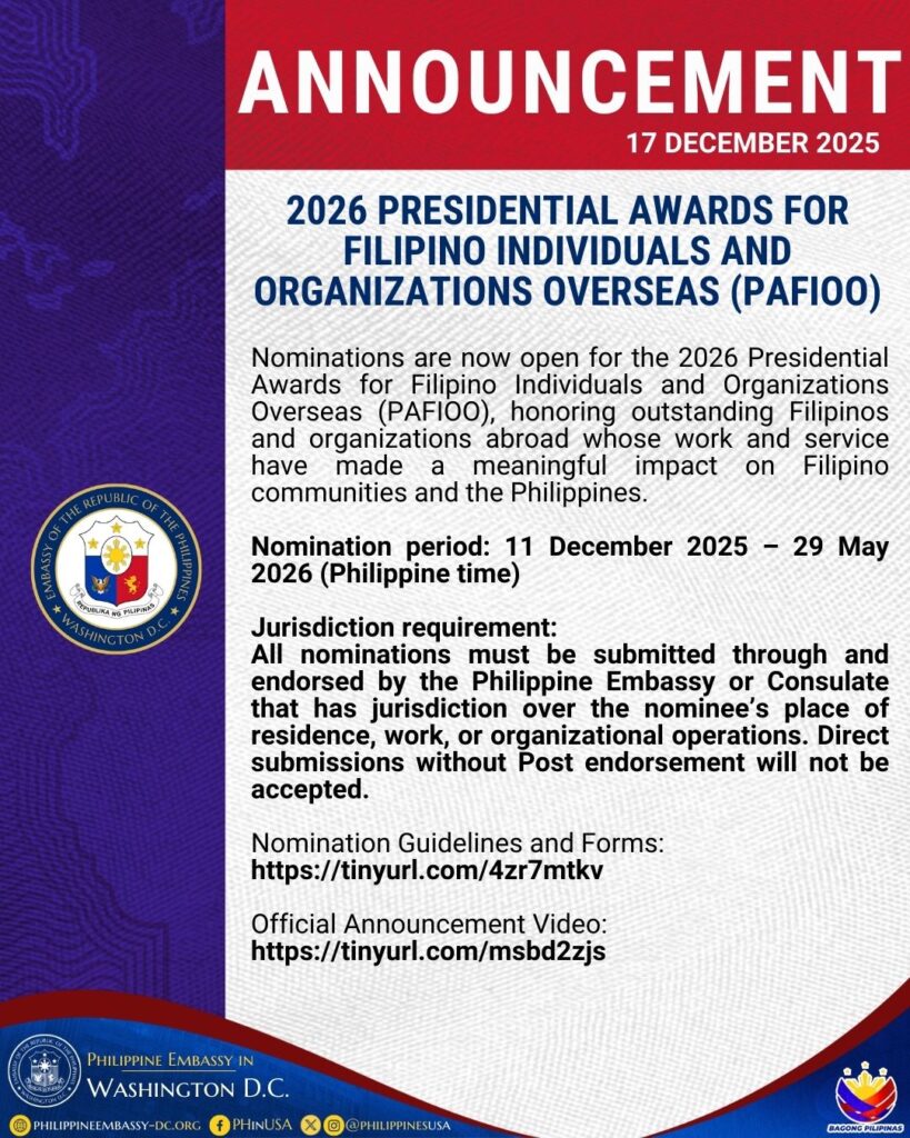 Nominations are now open for the 2026 Presidential Awards for Filipino Individuals and Organizations Overseas (PAFIOO), honoring outstanding Filipinos and organizations abroad whose work and service have made a meaningful impact on Filipino communities and the Philippines.