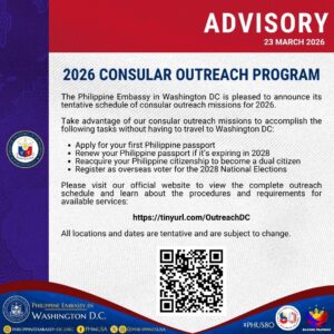 Announcements 2026 CONSULAR OUTREACH PROGRAM The Philippine Embassy in Washington DC is pleased to announce its tentative schedule of consular Read More ยป March 23, 2026