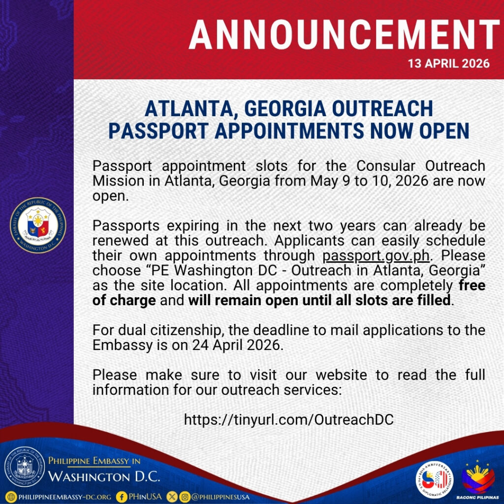 Passports expiring in the next two years can already be renewed at this outreach. Applicants can easily schedule their own appointments through passport.gov.ph. Please choose “PE Washington DC – Outreach in Atlanta, Georgia” as the site location. All appointments are completely free of charge and will remain open until all slots are filled.