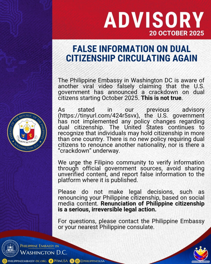 The Philippine Embassy in Washington DC is aware of another viral video falsely claiming that the U.S. government has announced a crackdown on dual citizens starting October 2025. This is not true.