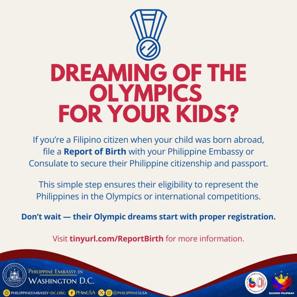 If your child was born abroad to a Filipino parent, report their birth so they can represent the Philippines on the world stage.