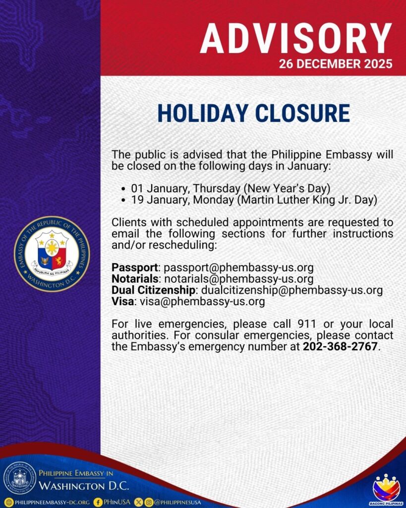 The public is advised that the Philippine Embassy will be closed on the following days in January: