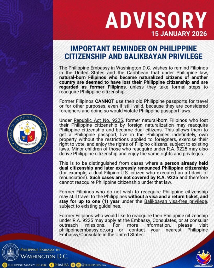 The Philippine Embassy in Washington D.C. wishes to remind Filipinos in the United States and the Caribbean that under Philippine law, natural-born Filipinos who became naturalized citizens of another country are deemed to have lost their Philippine citizenship and are regarded as former Filipinos, unless they take formal steps to reacquire Philippine citizenship.