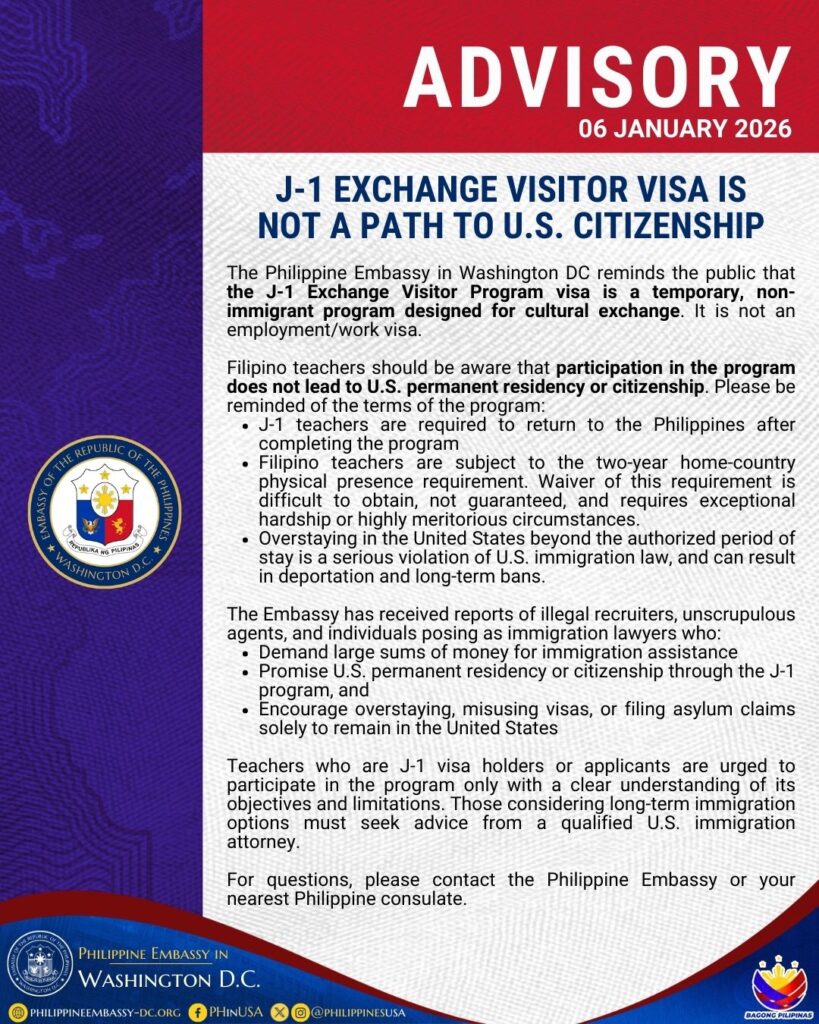 The Philippine Embassy in Washington DC reminds the public that the J-1 Exchange Visitor Program visa is a temporary, non-immigrant program designed for cultural exchange. It is not an employment/work visa.